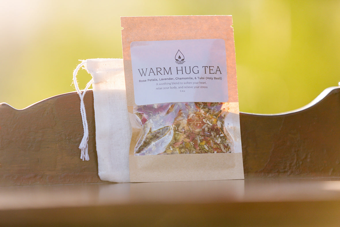 A 4oz organic herbal blend (with reusable cotton bag), intentionally chosen to give you the nourishing embrace you need: rose petals for tenderness, lavender for relaxation, chamomile for comfort, and Tulsi for regulation.