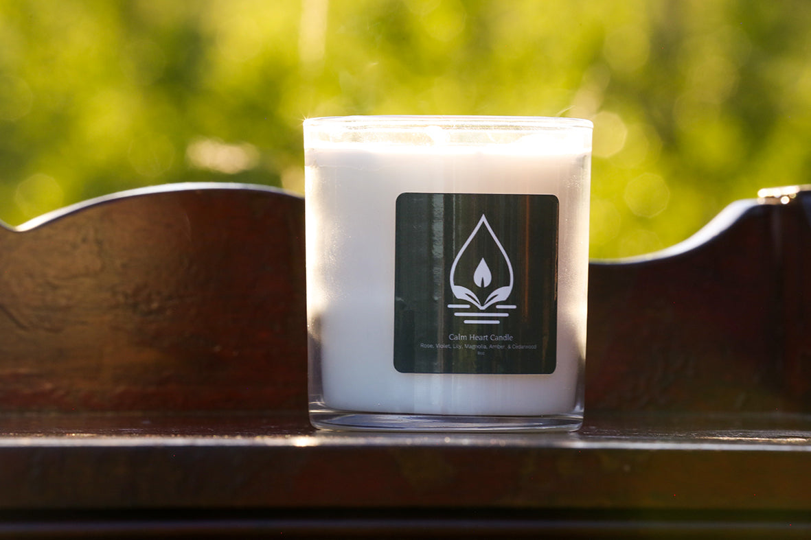 An 8oz hand-poured, clean-burning, long-lasting, coconut-soy wax candle to place somewhere meaningful. The scent includes organic essential oils: rose, violet, lily, magnolia, amber, & cedar-wood.